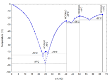 如下圖所示,鹽酸共有四個結晶的共熔點,分別對應四種晶體:68%(HCl的質(zhì)量分數(shù),下同)時的HCl·H2O、51%時的HCl·2H2O、41%時的HCl·3H2O和25%時的HCl·6H2O。另外在24.8%時還有一種亞穩(wěn)的HCl·3H2O生成。